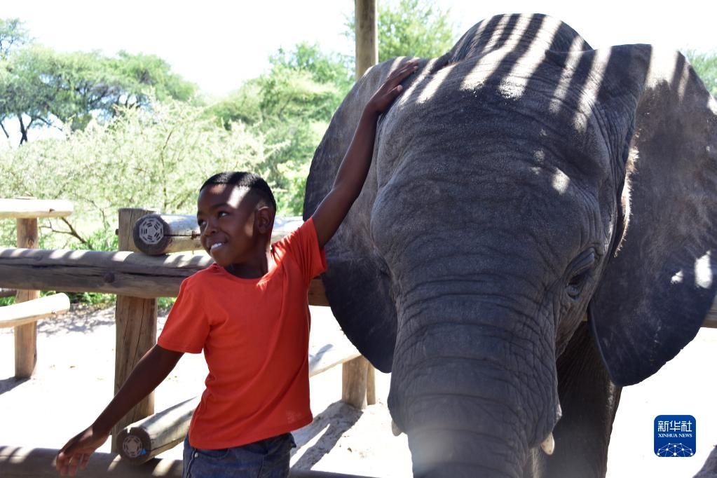 12月26日,在博茨瓦納東北部馬翁的大象孤兒院,一名兒童和幼象合影。