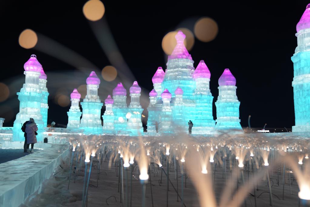 當日,許多市民和游客來(lái)到哈爾濱冰雪大世界園區游玩,迎接新年到來(lái)。