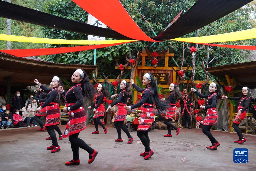 2022年12月31日,在云南省昆明市云南民族村佤族寨內,演員在為游客表演佤族傳統舞蹈。