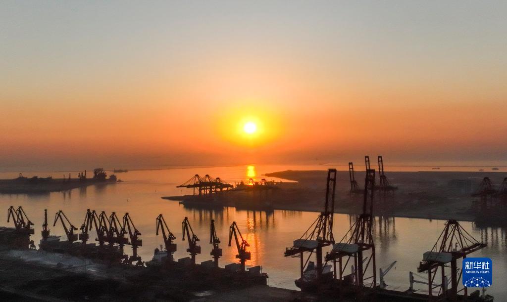 1月1日,晨光中的河北唐山港京唐港區碼頭(無(wú)人機照片)。