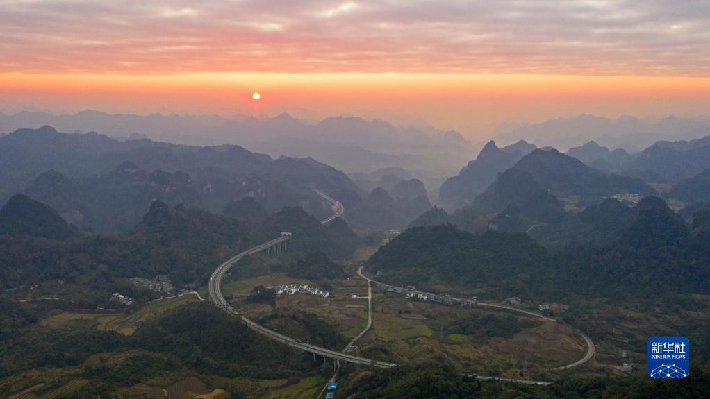 1月1日,廣西崇(左)靖(西)高速公路靖西市古龍山路段沐浴在新年晨光中(無(wú)人機照片)。