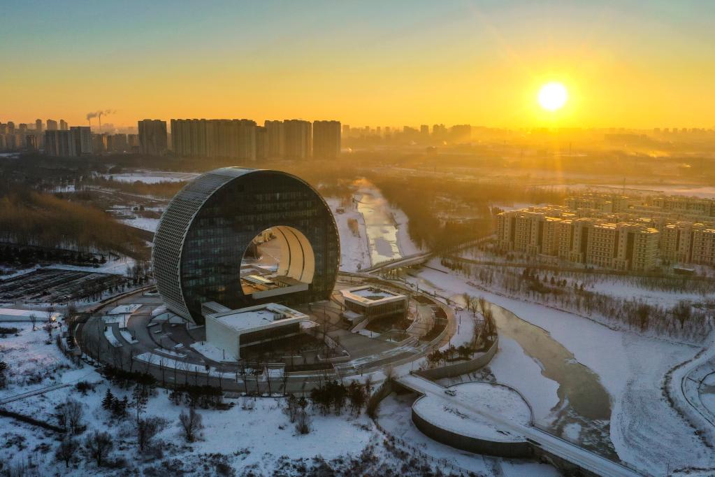 這是1月1日在吉林省長(cháng)春市拍攝的晨曦中的一汽紅旗創(chuàng )新大廈。