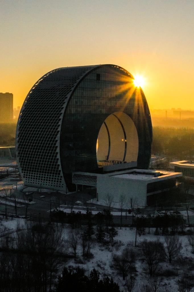 這是1月1日在吉林省長(cháng)春市拍攝的晨曦中的一汽紅旗創(chuàng )新大廈。
