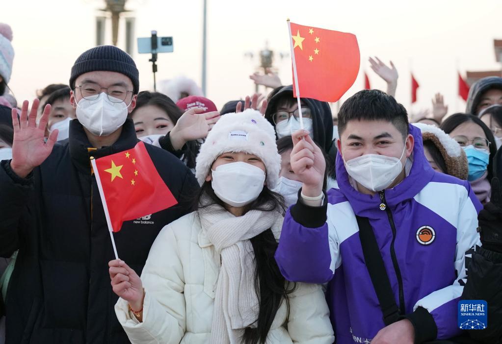 1月1日晨,北京天安門(mén)廣場(chǎng)舉行隆重的升國旗儀式。這是觀(guān)眾在升旗儀式結束后揮手致意。