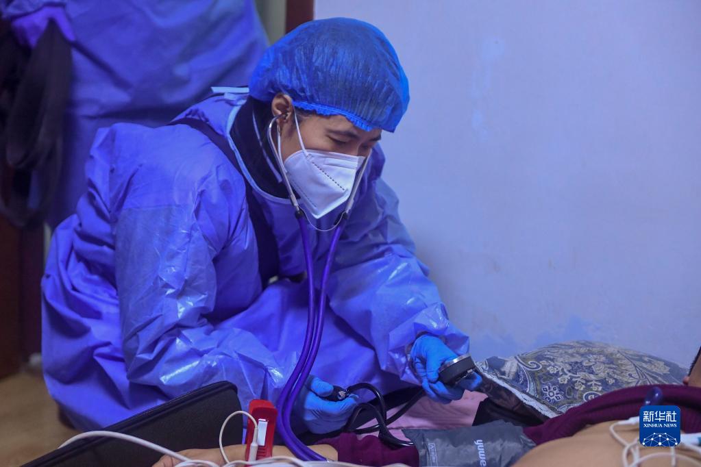 2022年12月31日,在患者家中,長(cháng)春市急救中心富民大街急救站醫生李立群檢查患者病情。