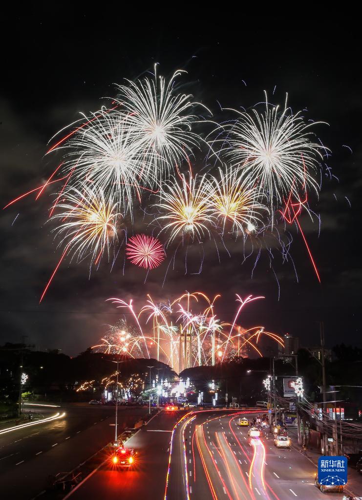 這是2023年1月1日在菲律賓奎松城拍攝的新年煙花。