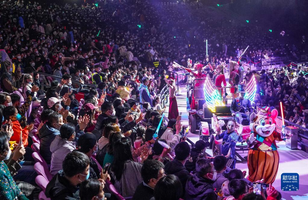 游客在廣州長(cháng)隆旅游度假區游園看馬戲迎接新年(2022年12月31日攝)。
