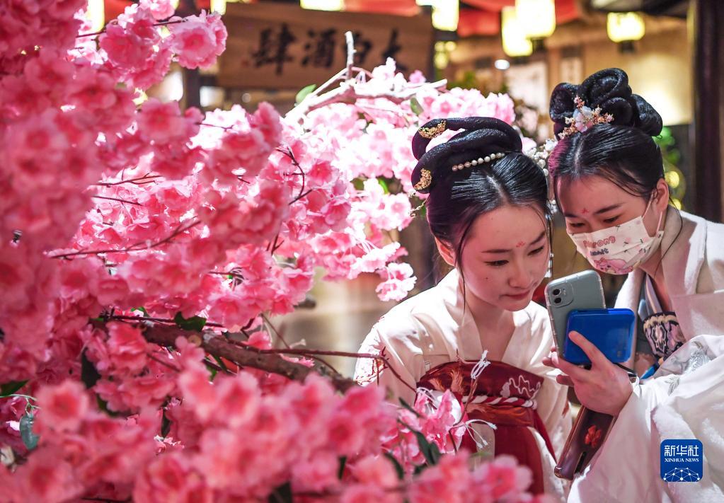 2022年12月31日,游客在長(cháng)安十二時(shí)辰主題街區游玩拍照。