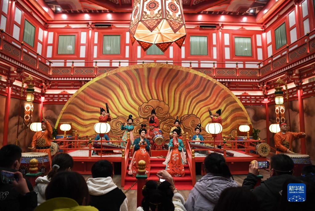 2022年12月31日,游客在長(cháng)安十二時(shí)辰主題街區觀(guān)看鼓樂(lè )表演。