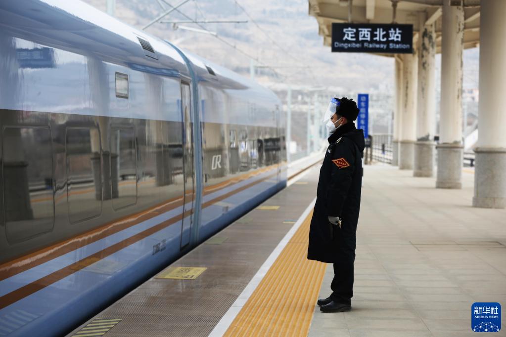 1月1日,寶蘭高鐵甘肅定西北站的工作人員在站臺上送車(chē)。