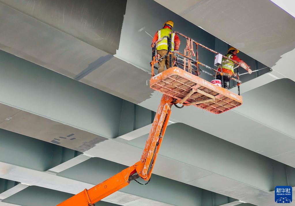 1月1日,建設工人在浙江省寧波市世紀大道快速路工程項目上給箱梁涂油漆。