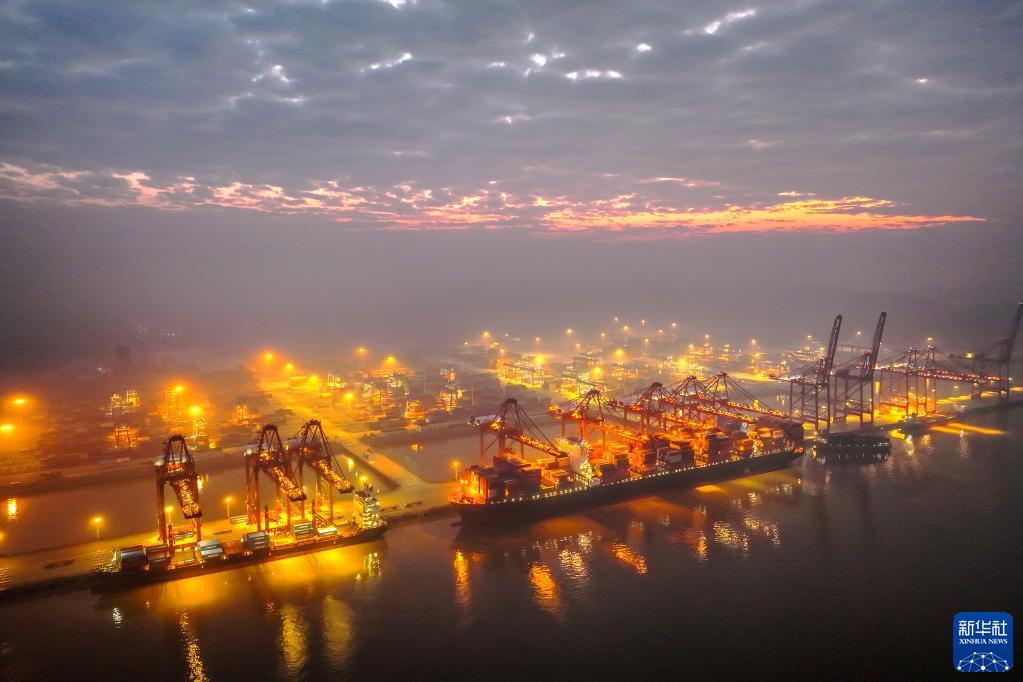 1月1日,集裝箱輪在寧波舟山港金塘港區大浦口集裝箱碼頭進(jìn)行裝卸作業(yè)(無(wú)人機照片)。