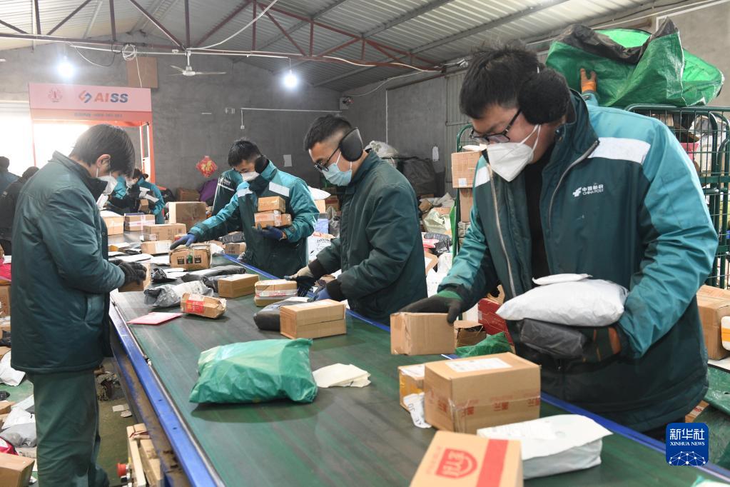 1月1日,在中國郵政集團公司河北新樂(lè )市分公司分揀車(chē)間,工作人員在分揀快遞。