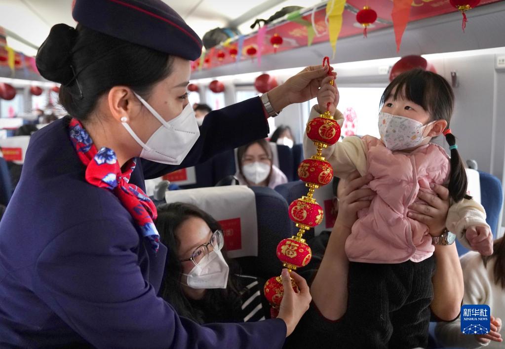 在2023年元旦到來(lái)之際,列車(chē)工作人員將車(chē)廂布置一新,舉行了“你好2023,相約2023”賀新年活動(dòng),為旅客獻上歡快的演出,送上新年的祝福。