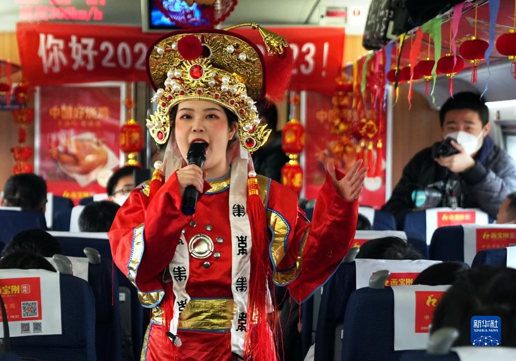 1月1日,列車(chē)工作人員在G2023次高鐵列車(chē)上為旅客表演豫劇。