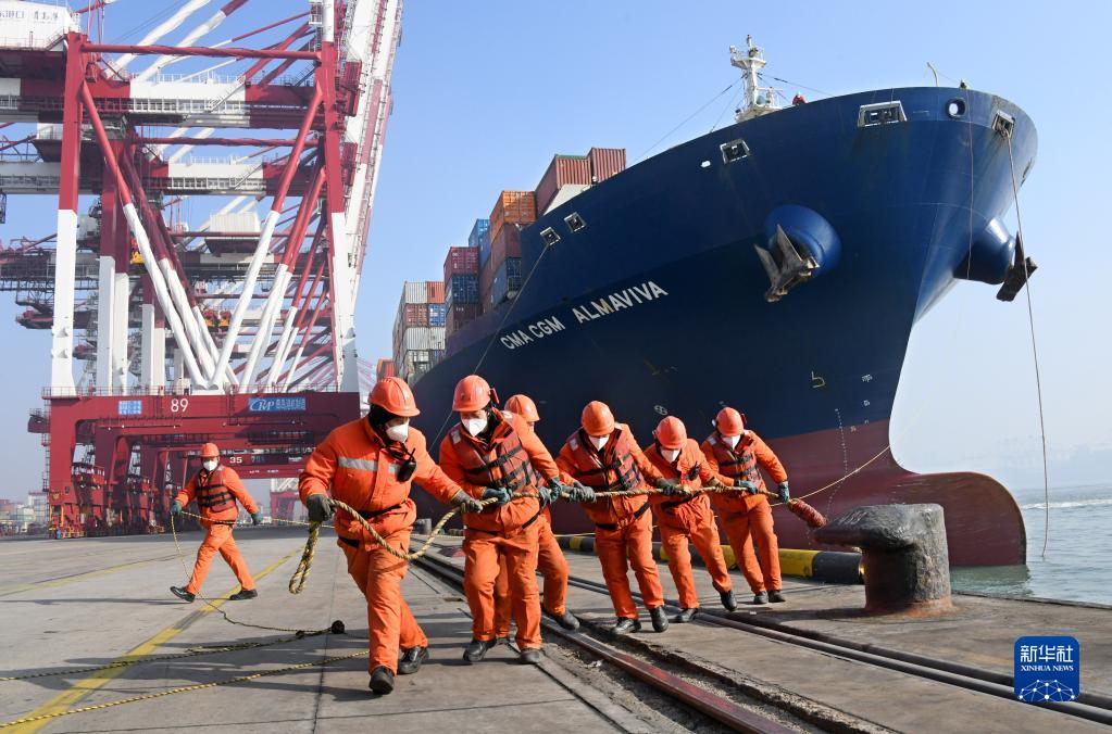 1月1日,青島港前灣QQCT集裝箱碼頭,碼頭工人在為剛靠岸的法國“達飛阿瑪維瓦”輪系纜。