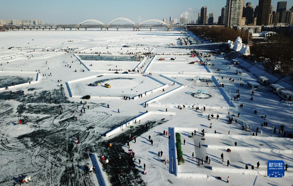 1月1日,游客在黑龍江省哈爾濱松花江冰雪嘉年華園區游玩(無(wú)人機照片)。