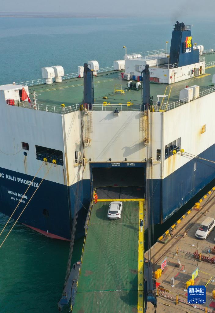 1月1日,大型汽車(chē)滾裝船“安吉鳳凰號”在江蘇連云港港汽車(chē)出口碼頭裝運車(chē)輛(無(wú)人機照片)。