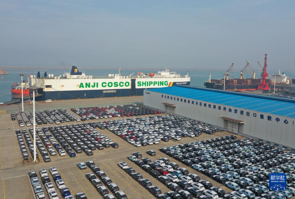 當日,1472臺出口車(chē)輛在江蘇連云港港碼頭裝船,該批車(chē)輛將由大型汽車(chē)滾裝船運往智利,這是該港2023年整船出口貨物第一單。