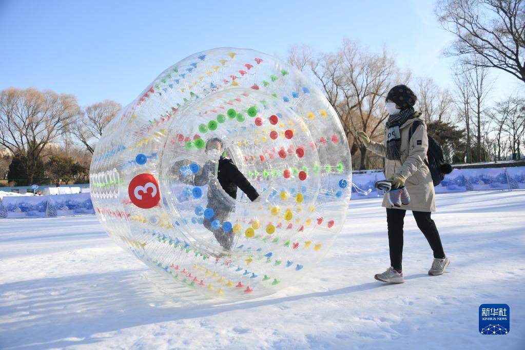 1月2日,一名小朋友在北京玉淵潭公園體驗“雪地悠波球”。