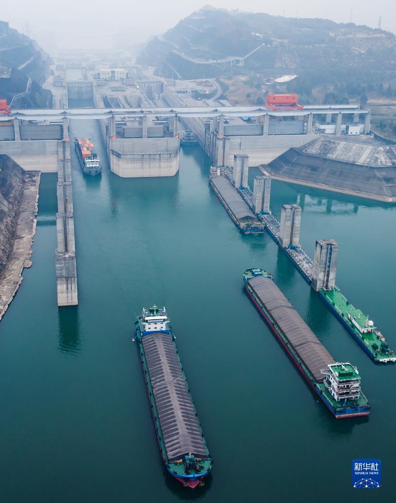 1月1日,船舶有序通過(guò)三峽雙線(xiàn)五級船閘(無(wú)人機照片)。