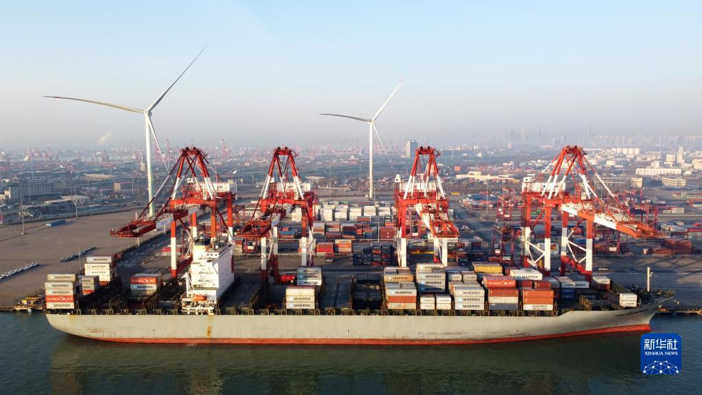 1月1日,一艘貨輪靠泊在天津港聯(lián)盟國際集裝箱碼頭進(jìn)行裝卸作業(yè)(無(wú)人機照片)。