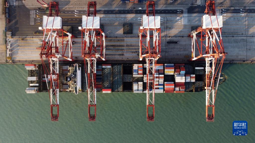 1月1日,一艘貨輪靠泊在天津港聯(lián)盟國際集裝箱碼頭進(jìn)行裝卸作業(yè)(無(wú)人機照片)。