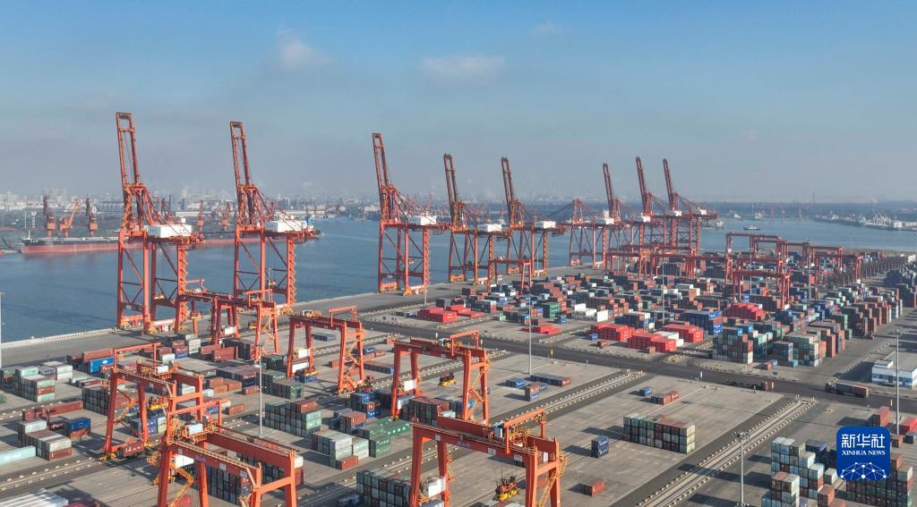 1月3日拍攝的河北唐山港京唐港區集裝箱碼頭(無(wú)人機照片)。