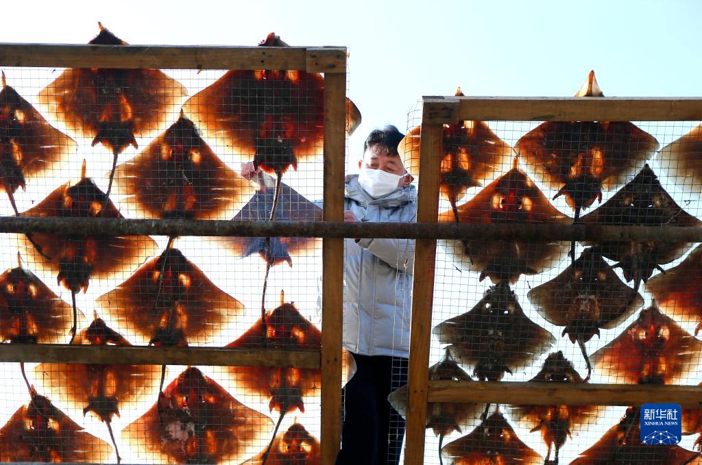 春節臨近,山東省青島市即墨區鰲山衛街道的漁民利用晴好天氣,將捕獲的海魚(yú)進(jìn)行切割、腌制、晾曬,加工成魚(yú)干,供應節日市場(chǎng)。
