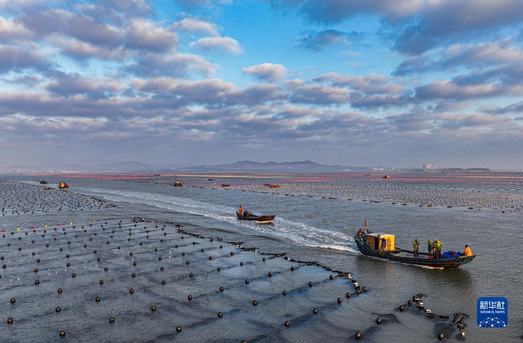 當日,在山東省榮成市尋山街道愛(ài)倫灣海洋牧場(chǎng),漁民駕駛漁船在海上忙碌著(zhù),呈現一幅“海上冬耕”的畫(huà)面。