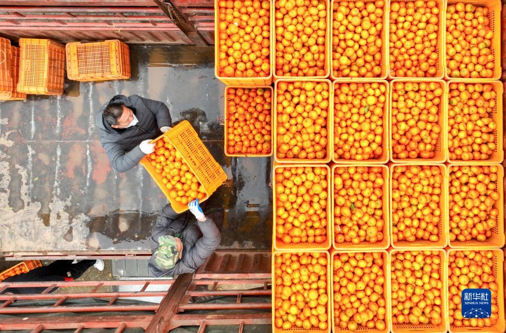 1月3日,在湖南省永州市道縣清塘鎮尹家村真秀農業(yè)果園基地,農民在裝運柑橘(無(wú)人機照片)。