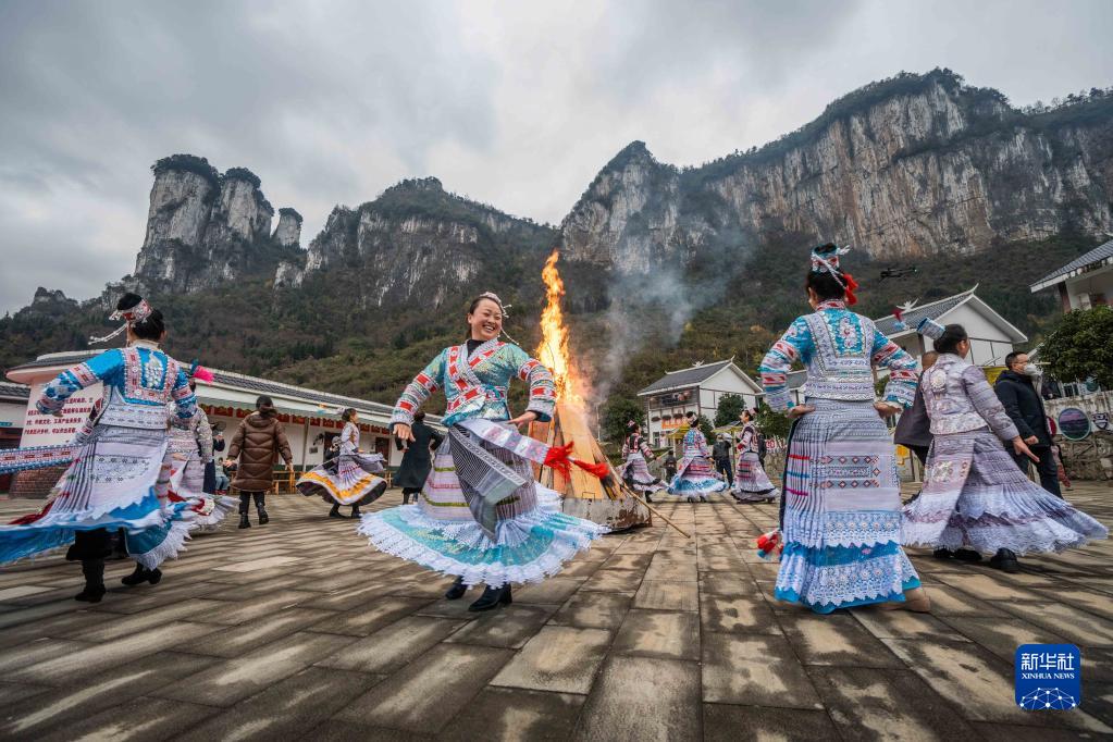 1月2日,游客在貴州省黔西市新仁苗族鄉化屋村和苗族同胞一起圍著(zhù)篝火跳舞。