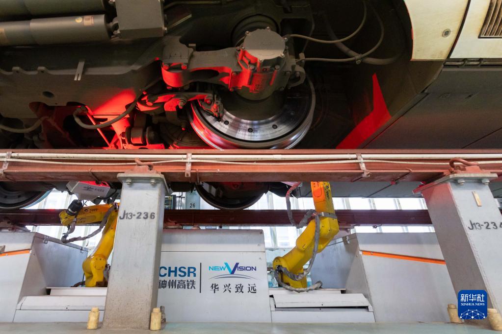 1月3日,動(dòng)車(chē)組檢修機器人在上海虹橋動(dòng)車(chē)運用所檢查動(dòng)車(chē)組車(chē)底。