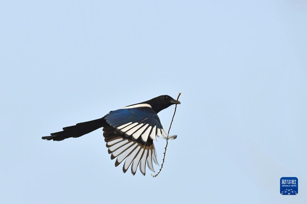 1月1日,在山東省滕州市西崗鎮,喜鵲叼著(zhù)樹(shù)枝準備筑巢。