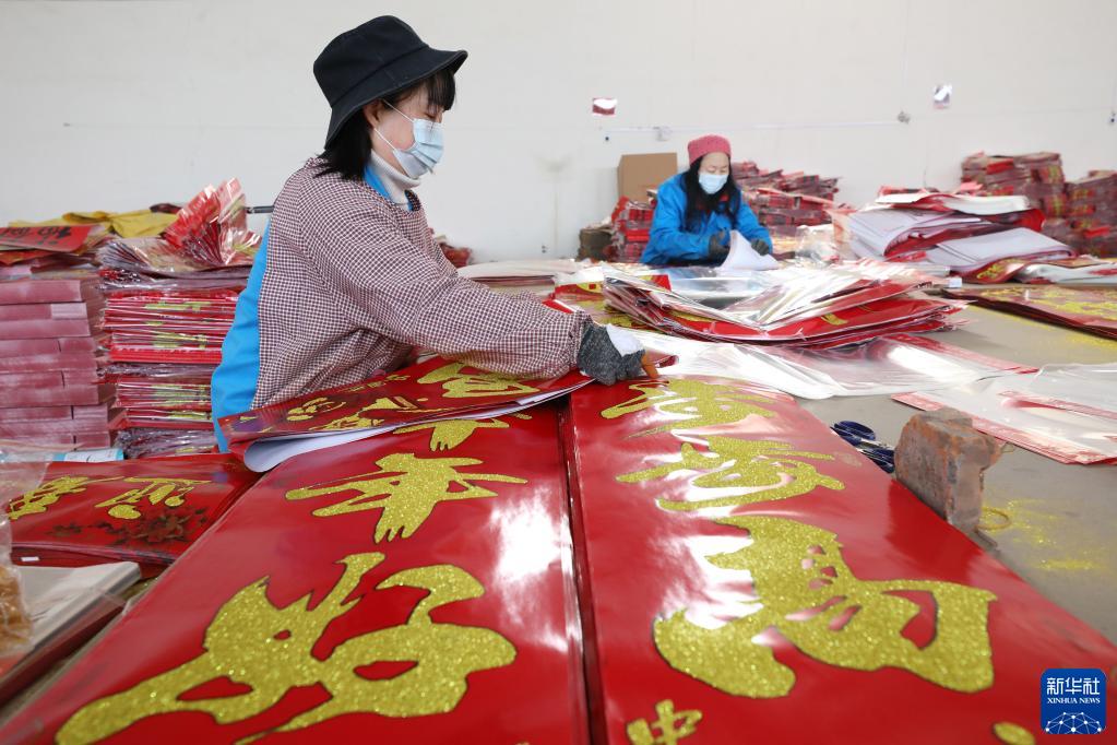1月3日,焦作市溫縣岳村街道呂村村民在包裝春聯(lián)。