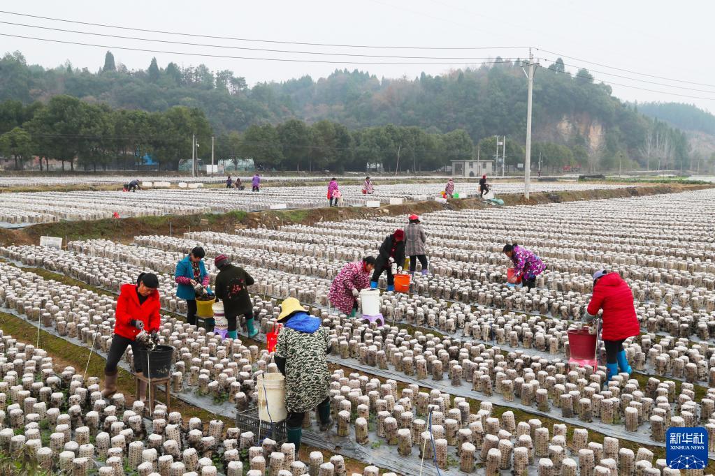 1月3日,湖南省永州市新田縣新圩鎮長(cháng)富村村民在采摘黑木耳供應市場(chǎng)。