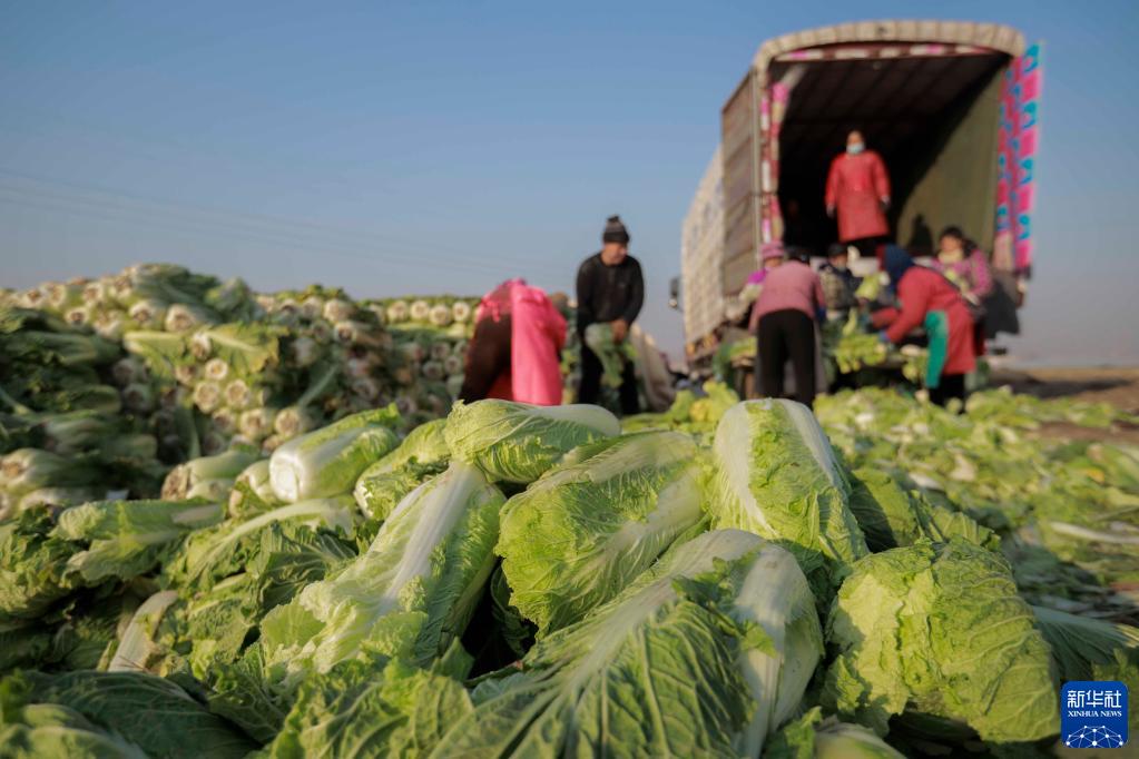 1月4日,河北省玉田縣虹橋鎮農民將大白菜裝車(chē)外運。