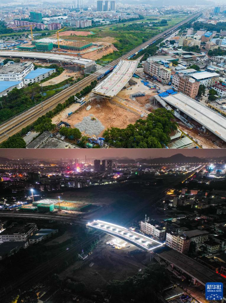 這是東莞環(huán)市南路上跨廣深鐵路轉體梁轉體前后的拼版照片(上圖1月3日攝,下圖1月4日攝,無(wú)人機照片)。
