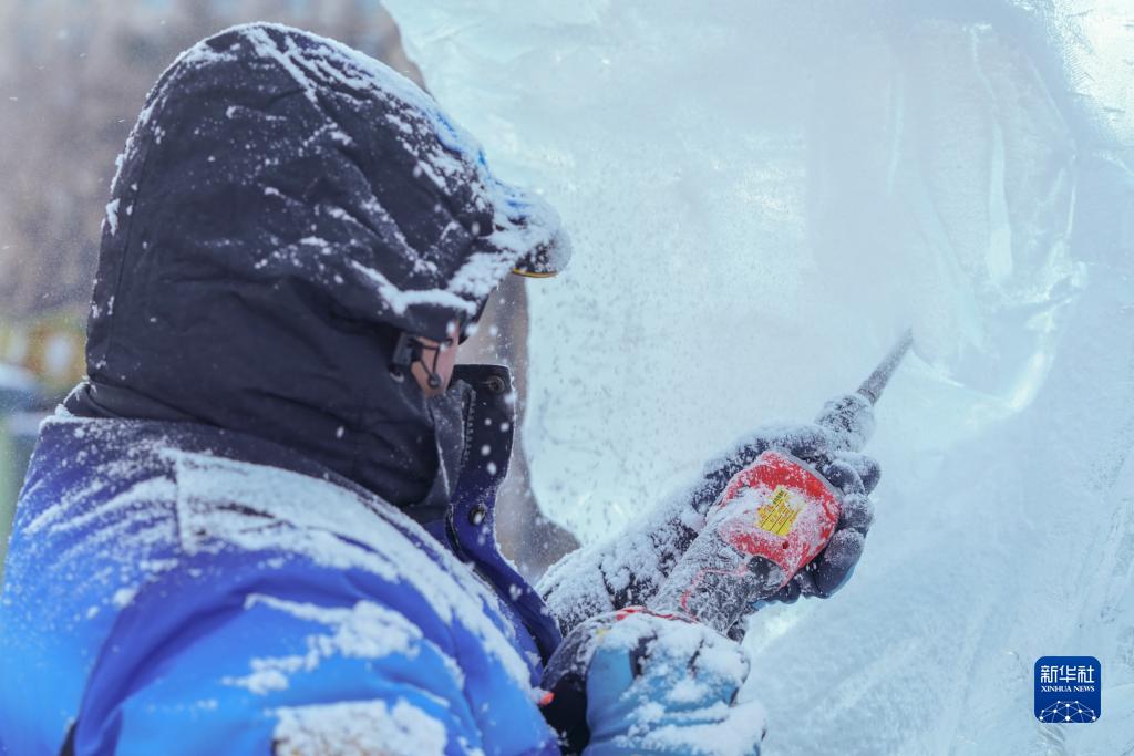 1月4日,在哈爾濱冰燈藝術(shù)游園會(huì )園區,冰雕師在進(jìn)行冰雕藝術(shù)作品創(chuàng )作。