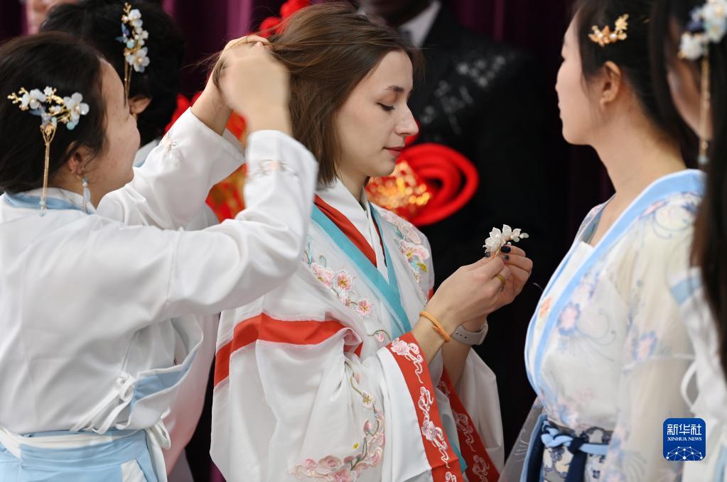 當日,天津大學(xué)國際教育學(xué)院的留學(xué)生為參加“校園春晚”加緊排練文藝節目。他們身穿漢服演唱中文歌曲,排練傳統古典舞蹈等節目,感受中國傳統文化的魅力。