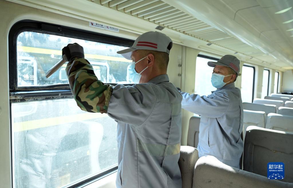 1月4日,在中國鐵路上海局集團有限公司合肥車(chē)輛段合肥客車(chē)整備場(chǎng),工作人員對旅客列車(chē)車(chē)窗進(jìn)行整修。