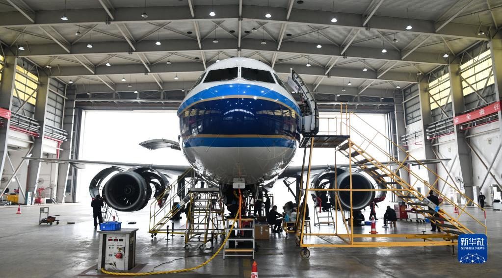 春運將至,航空公司組織工程師加強飛機檢修維護工作,保障旅客出行安全。