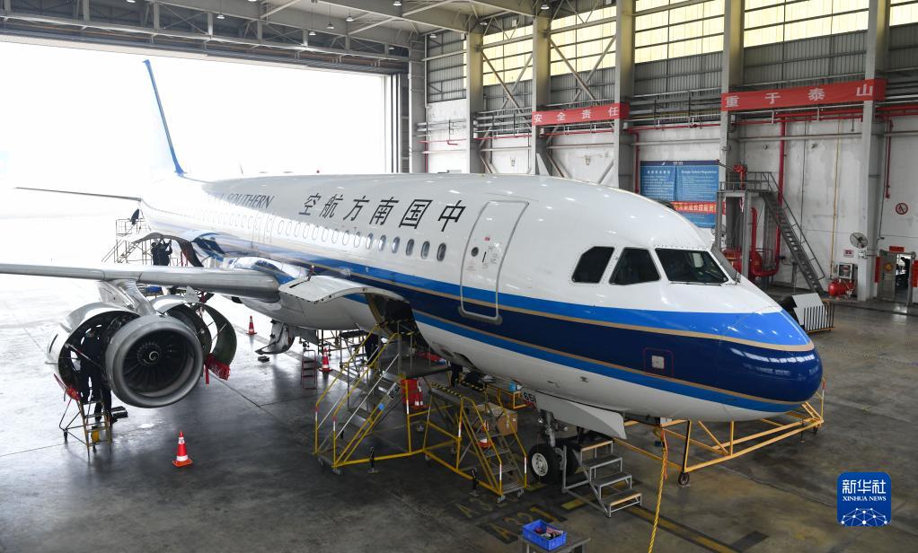 1月5日,在位于海南省??谑械闹袊戏胶娇彰捞m基地機庫,工程師在對飛機進(jìn)行檢修。