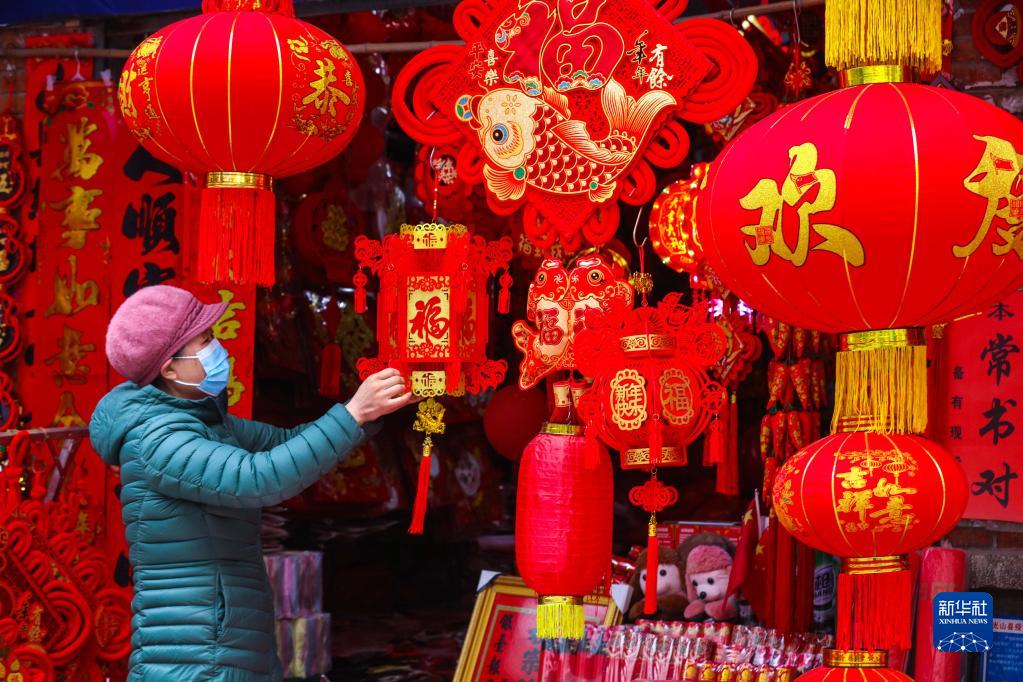 1月5日,市民在河南省信陽(yáng)市光山縣一處市場(chǎng)內選購春節飾品。