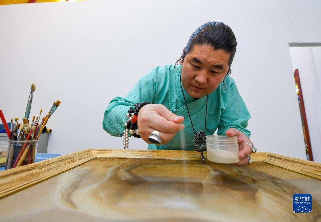 內蒙古錫林郭勒盟正藍旗位于渾善達克沙地腹地,生活于此的80后蒙古族青年阿拉騰畢力格取沙為材,進(jìn)行沙畫(huà)藝術(shù)作品創(chuàng )作。他對渾善達克沙地中顏色各異的沙粒進(jìn)行淘洗、篩選、清理雜質(zhì)、曬干等操作后,加上用糯米汁、牛角等材料熬制而成的天然膠水,就能使各色沙粒在充分粘貼的情況下,依然保持其色彩。他的沙畫(huà)作品色彩自然、造型古樸,獨具特色。