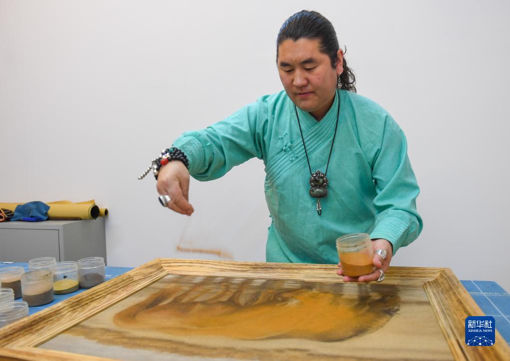 內蒙古錫林郭勒盟正藍旗位于渾善達克沙地腹地,生活于此的80后蒙古族青年阿拉騰畢力格取沙為材,進(jìn)行沙畫(huà)藝術(shù)作品創(chuàng )作。他對渾善達克沙地中顏色各異的沙粒進(jìn)行淘洗、篩選、清理雜質(zhì)、曬干等操作后,加上用糯米汁、牛角等材料熬制而成的天然膠水,就能使各色沙粒在充分粘貼的情況下,依然保持其色彩。他的沙畫(huà)作品色彩自然、造型古樸,獨具特色。