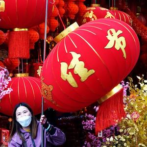 1月5日,在廣西南寧市上海路的年貨市場(chǎng),銷(xiāo)售人員在幫顧客挑選大紅燈籠。