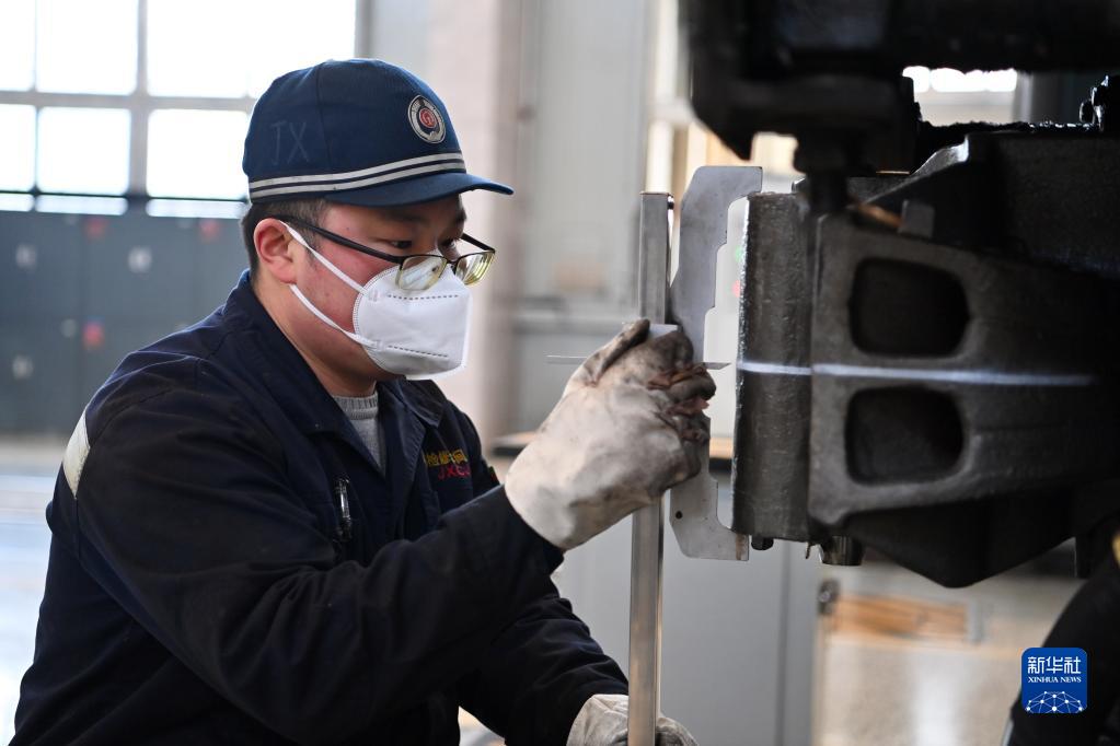 1月6日,在中國鐵路太原局集團有限公司太原車(chē)輛段太原檢修車(chē)間,工作人員在進(jìn)行測量作業(yè)。