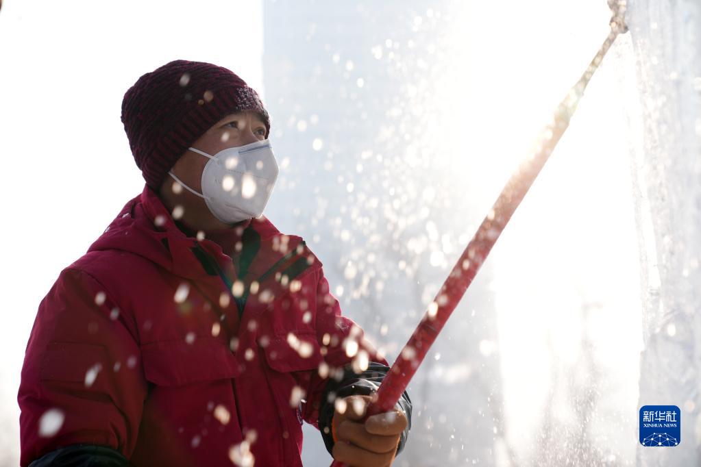 1月6日,在哈爾濱冰燈藝術(shù)游園會(huì )園區,冰雕師在進(jìn)行冰雕作品創(chuàng )作。
