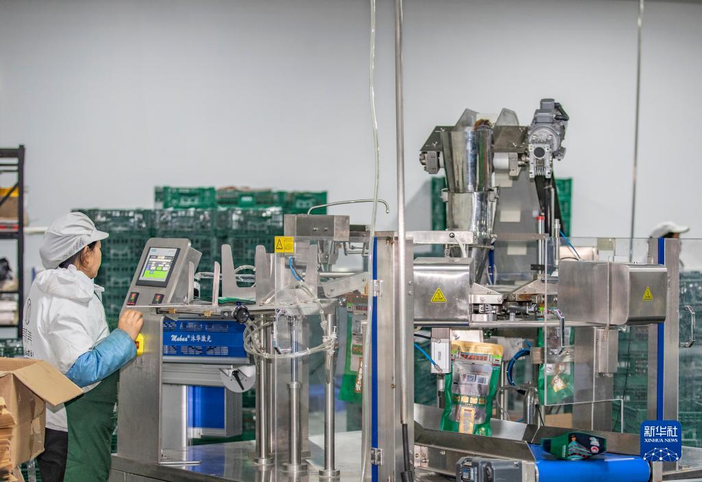 1月4日,在重慶市城口縣坪壩鎮新華村重慶美綴美食品有限公司,工人在操作自動(dòng)打包機打包臘肉。